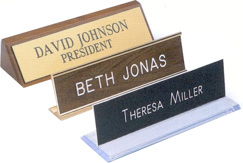 DESK & WALL SIGNS Engraved plastic signs to sit on your desk or hand on the wall. Walnut or metal holders. Select from many attractive colors.